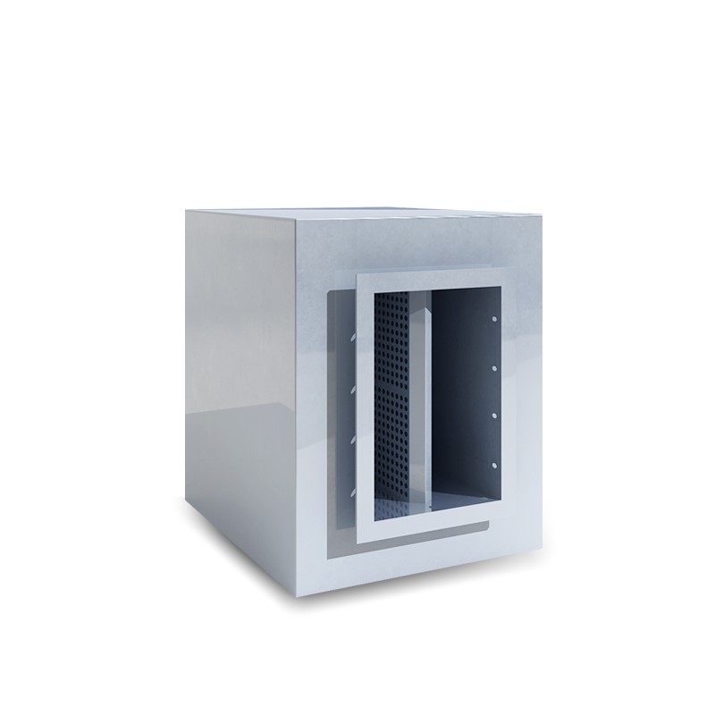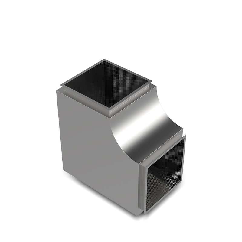 本消聲彎頭采用外角內圓結構,有利于提高消聲效果,減小阻力損失,降低再生噪音,外殼采用鋼板( 或鍍鋅板),吸聲材料為玻璃布包超細玻璃棉,并以木框或鋼框作龍骨,保證吸聲材料在高速氣流下的穩定性。