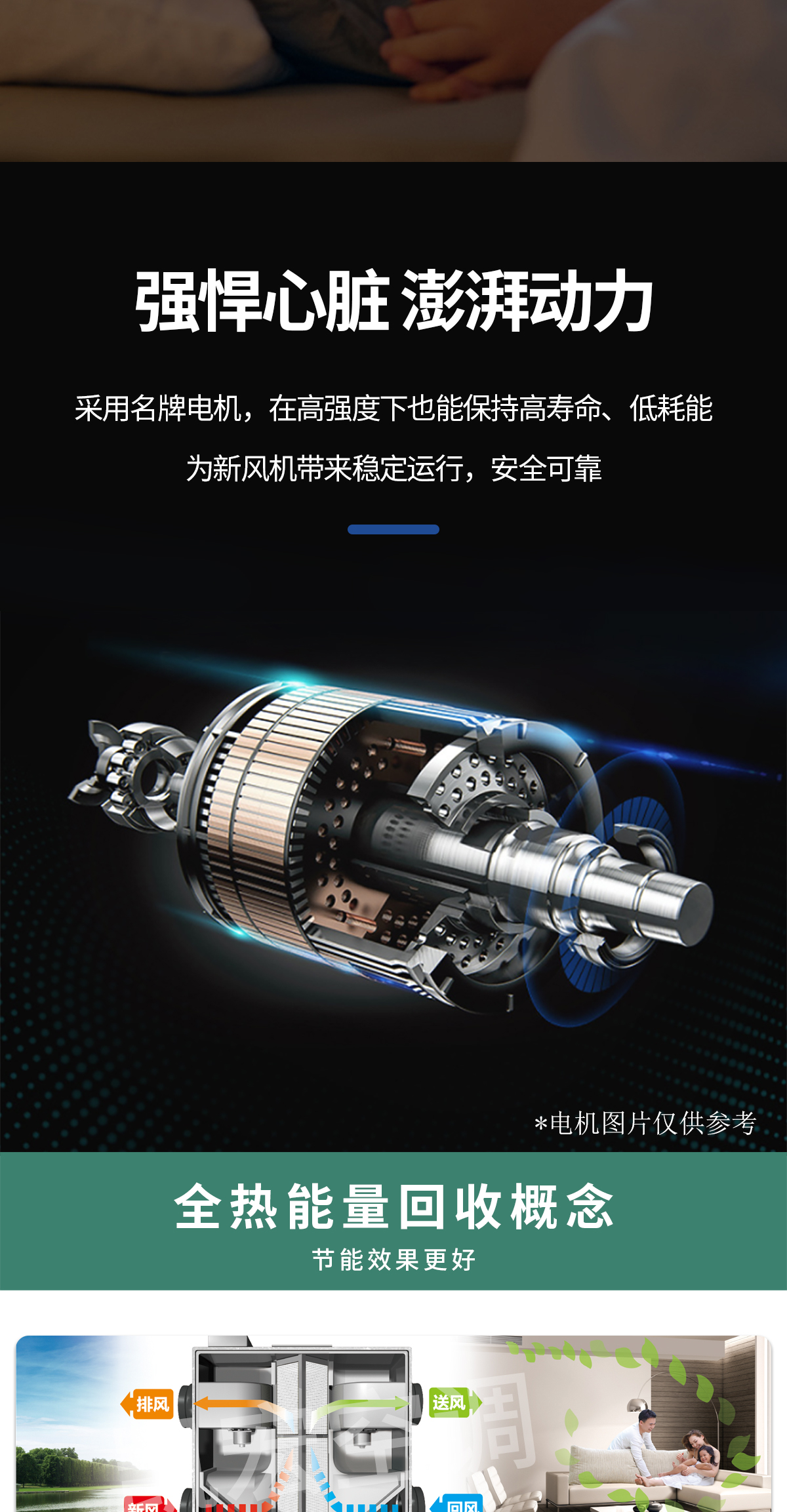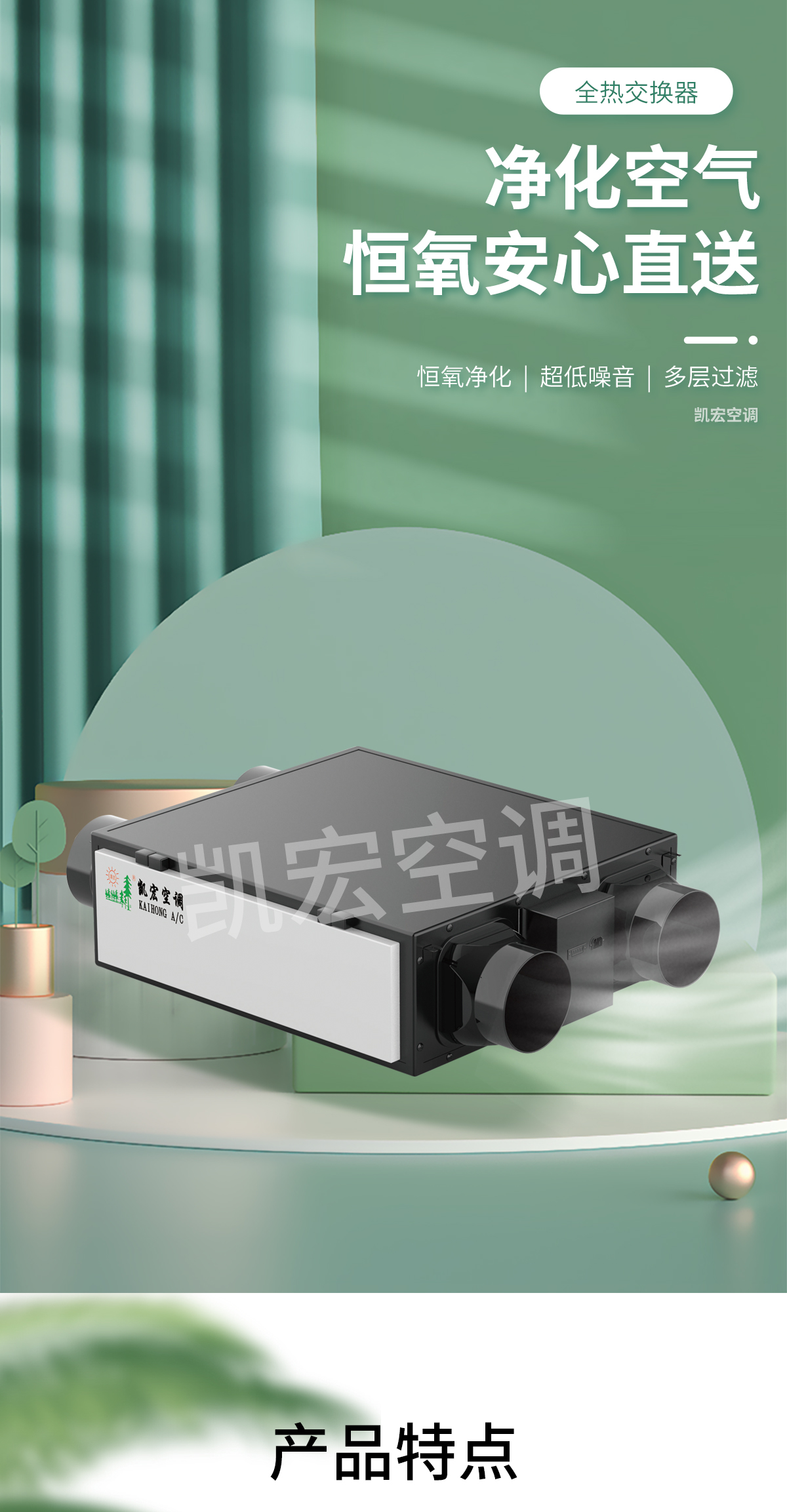 雙向換氣 室內外氣體等量置換。獨特的熱交換器設計,把室內污濁空氣與室外新鮮空完全分開,防止室內外空氣交叉污染 靜音設計,安全可靠 內置低噪音外轉子離心風機,機組璧覆有新型吸聲材料,運行平穩噪音低,防止了對現場的干擾。整機除風機外無運動部件,幾乎無需維護,可確保長期穩定可靠工作 過濾凈化功能 進入室內的空氣在機組中經專業級過濾器過濾,有效防止灰塵和有害物質進入室內,保持室內空氣新鮮,同時可選用靜電凈化器、負離子發生器、光觸媒等凈化設備
