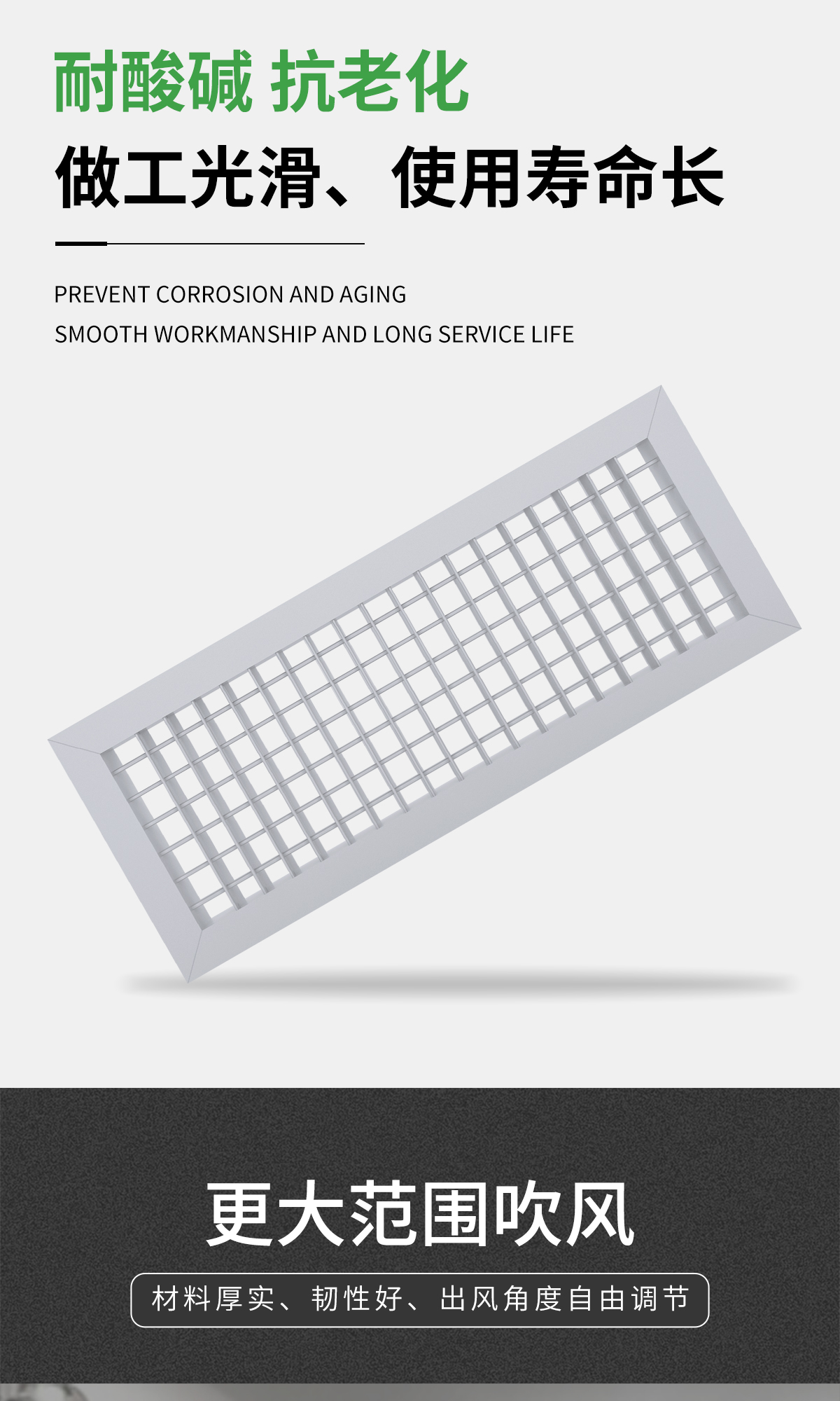 調(diào)節(jié)百葉式送風(fēng)口 可直接與風(fēng)機(jī)盤管配套使用 尺寸由用戶選定 可用于中央空調(diào)系統(tǒng)的末端,葉片角,度可在任意范圍內(nèi)調(diào)節(jié),葉片在不同角度,可得到不同的送風(fēng)距離和不同的擴(kuò)散角
